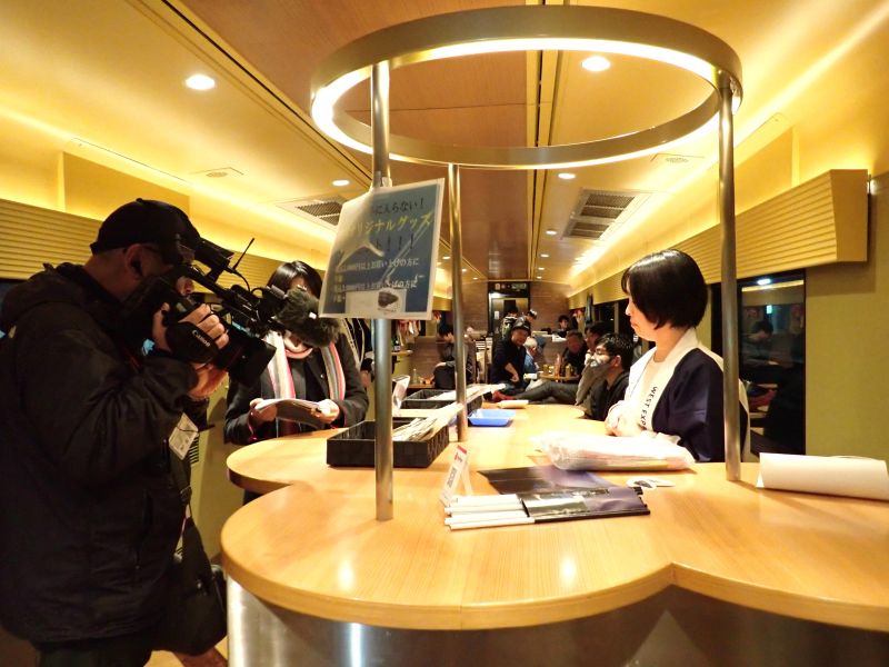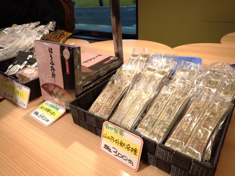 入線から山口県内走行中は4号車のフリースペース「遊星」で下関市をはじめ防府市や岩国市などの特産品の販売が行われていました