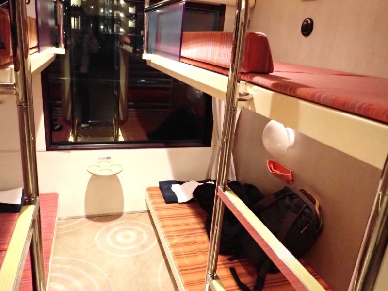 今回利用したのは2号車の「クシェット」と呼ばれるかつての簡易寝台のように横になってくつろげる座席。ひとつのボックスに上下2段4つの座席があります