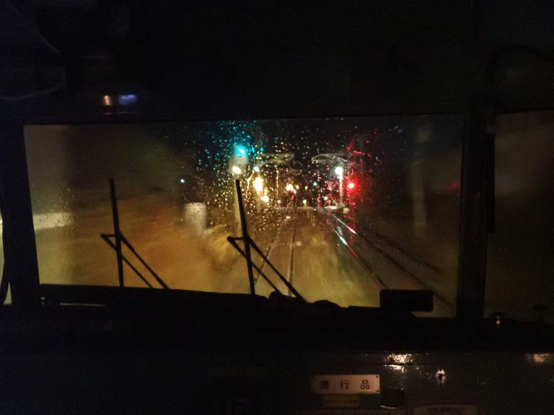 先頭車両からの光景。雨が降り続いていました
