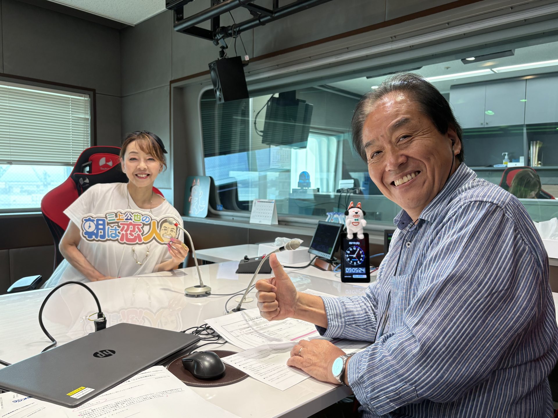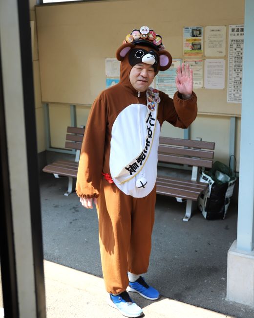 下車前に寝起きの顔で記念撮影