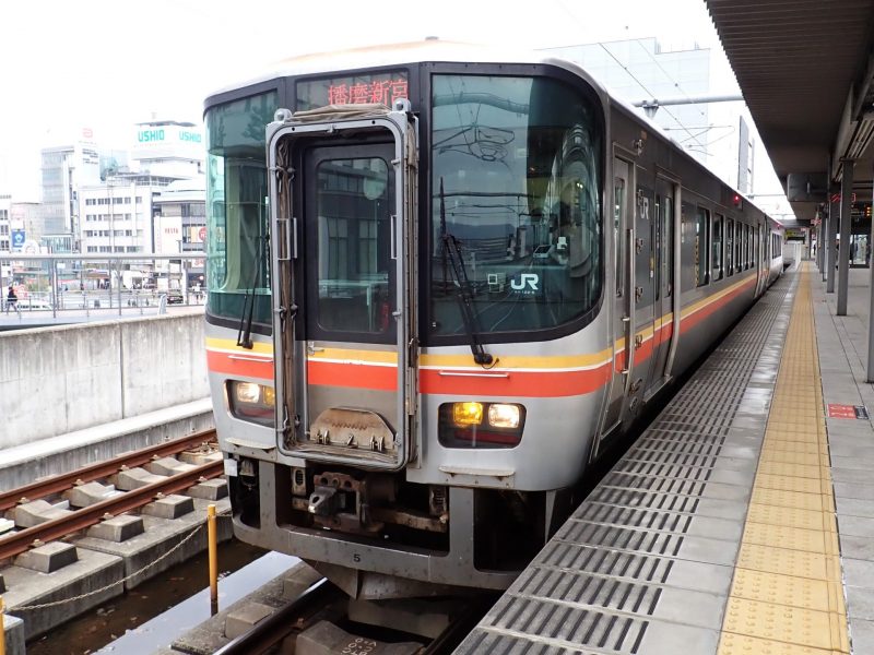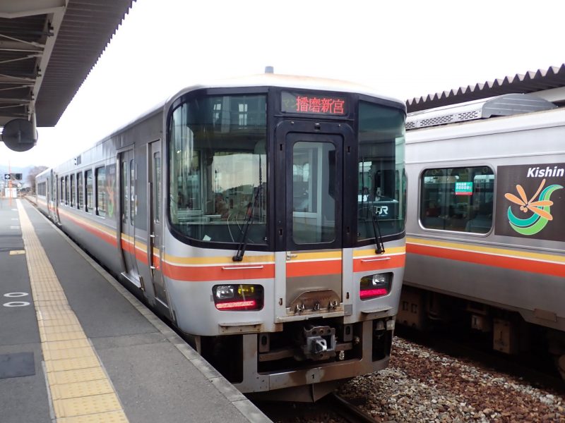 姫新線は兵庫県の姫路駅と岡山県の新見駅間158.1kmを結ぶ路線。車両はキハ127系気動車