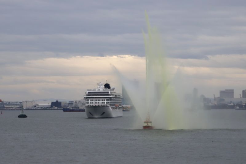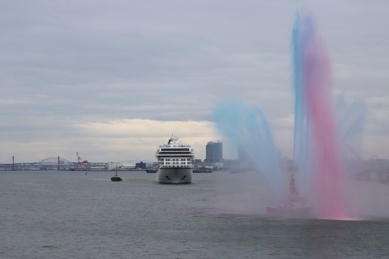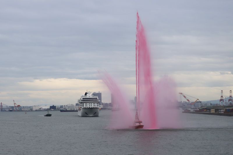 神戸市消防艇「たかとり」の歓迎放水を受けながらターミナルに近づいてきます