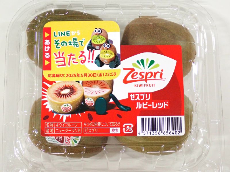 キウイの本場ニュージーランドに本社を置くゼスプリが20年以上の歳月をかけて開発した商品で、宝石のような赤い果肉と熟したベリーのような上品な甘さ、ジューシーな果汁が売りとのこと。グリーンやサンゴールドよりビタミンCが豊富でアントシアニンも含まれているそう。今年の販売期間はまもなく終了となるようです。