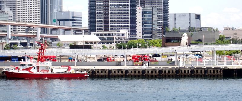 すると対岸の中突堤に消防艇「たかとり」が停泊。周辺で赤色灯をつけた消防車両が数台停まっているのが見えました