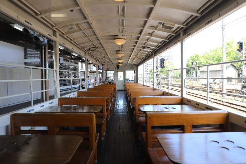 トロッコ車両は木の椅子とテーブルのボックスタイプ