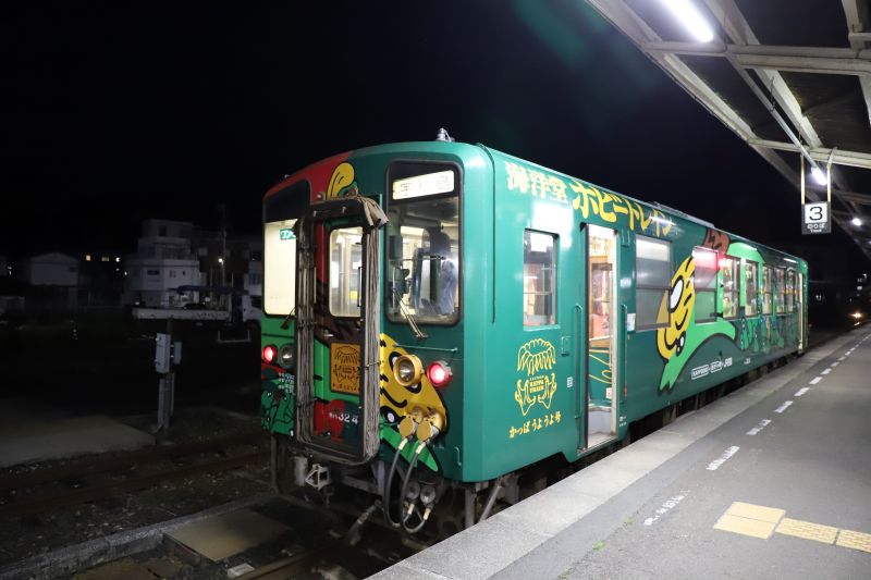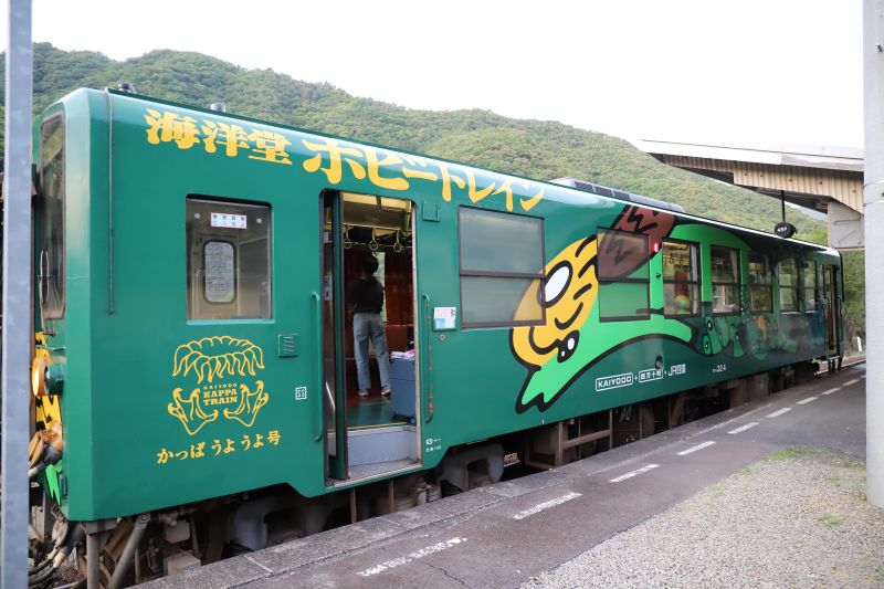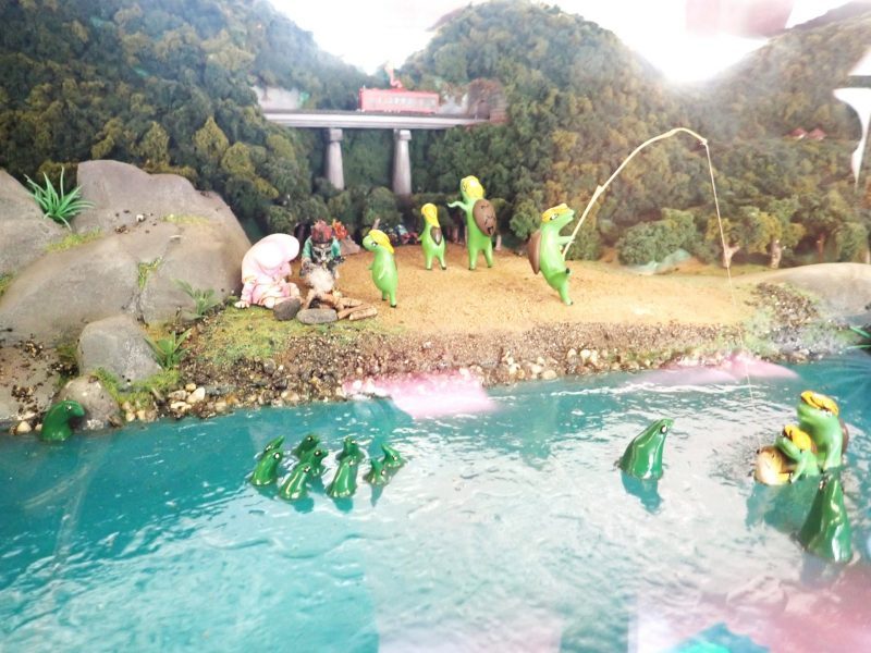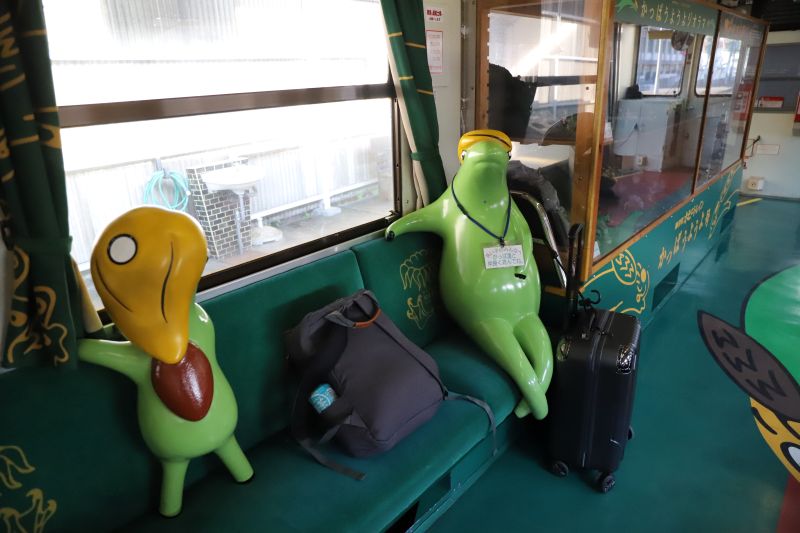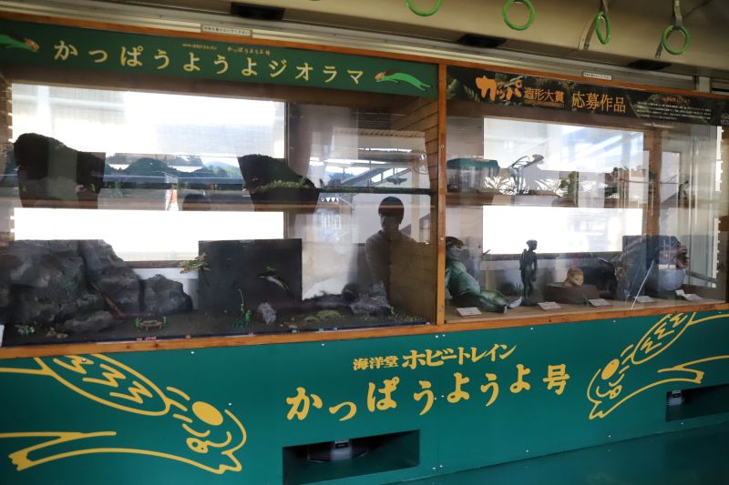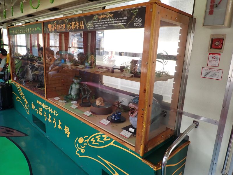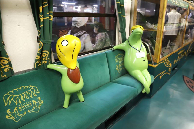 海洋堂の創設者である高知県黒潮町出身の宮脇修さんが2023年に高齢者の遊び場となる「かっぱランド」を創設する構想を掲げ、海洋堂本社と自宅のあった大阪府門真市から四万十町に移住。宮脇さんは今年2月に亡くなり現在かっぱ館は休館中とのことですが、四万十川カッパ造形大賞の作品をはじめ数多くのユニークなかっぱたちが展示されているそうです。列車内はまさにかっぱがうようよいました!