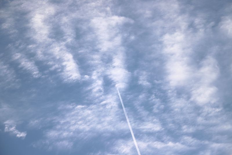 空に飛行機雲を残しながら飛ぶ旅客機。航路なのですね!