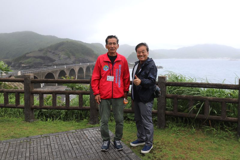 ガイドをしてくださった辻和夫さんと雨の中で記念撮影。甑島在住の元薩摩川内市職員で島を知り尽くした方です