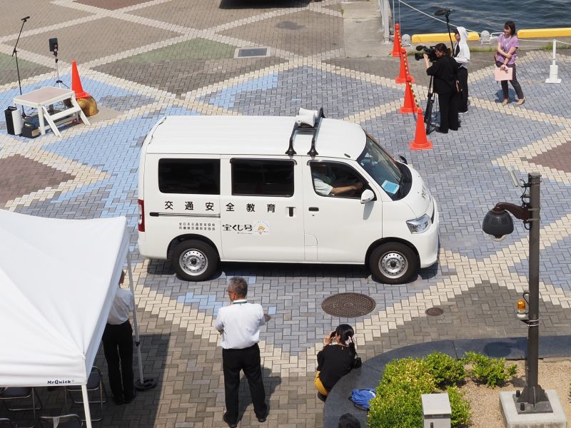 広報車両にはラジオパーソナリティの谷五郎さんが乗車し、拡声器を使ってバス事故防止に協力をと呼びかけました