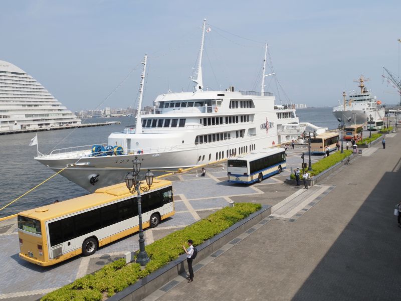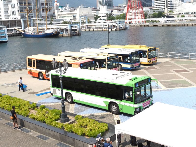 きのう午後、炎天下の下神戸ハーバーランドの高浜岸壁に路線バスが集まっていました