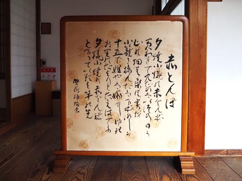 衝立に書かれた童謡「赤とんぼ」の歌詞