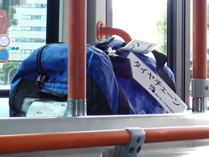 神戸市バスの車内。運転席近くの荷台にタイヤチェーンが積まれていました。備えあればですね