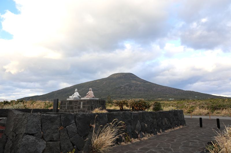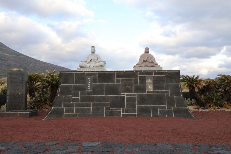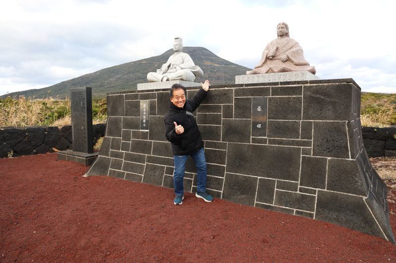 ご縁につながる観光スポットとのことで像と八丈富士をバックに記念撮影
