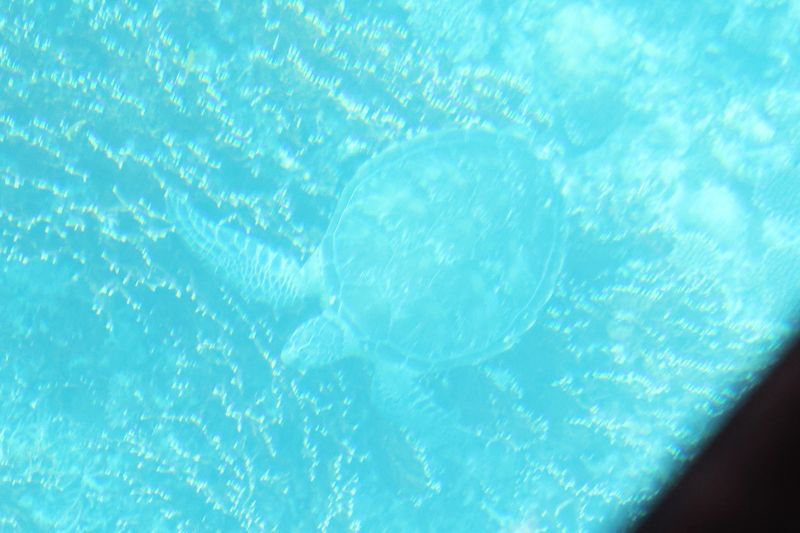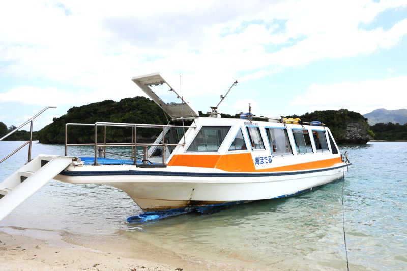 砂浜に乗り上げられたグラスボート船「海ほたる」に乗って湾内を遊覧クルーズ。通常料金は大人で1,700円ですが、Web事前予約で23%オフの1,300円になります(ぐるくん)