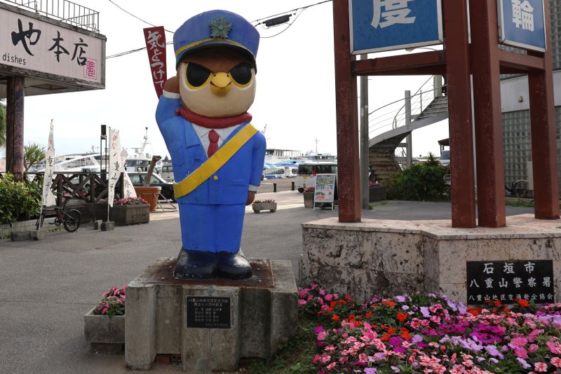 夕食前に近くを散策。石垣市公認のマスコットキャラクター「ぱいーぐる」が警察官の格好をして交通安全を呼びかけています。「ぱいーぐる」は八重山諸島に生息する特別天然記念物のカンムリワシをモチーフにしているそう