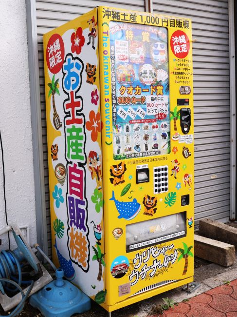 こんな沖縄土産の自販機がありました。クオカードが入っていたら「あたり」というもの