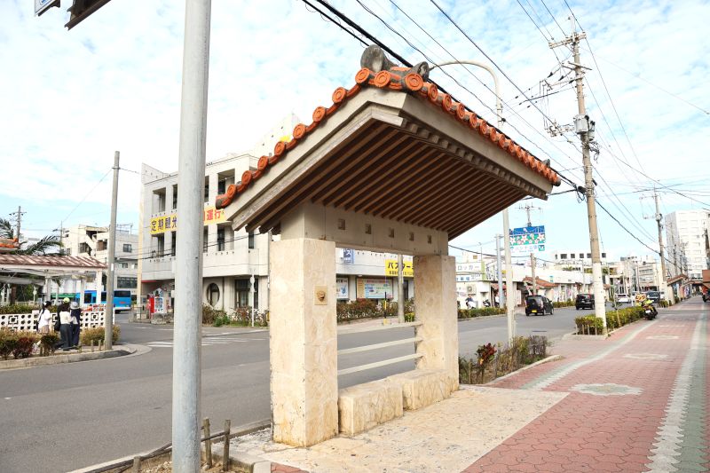 歩道に設置された屋根付きの休憩場所。夏は強い日差し除けになるのでしょう