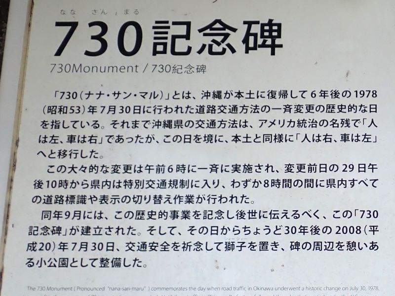 沖縄が本土に復帰して6年後に行われた道路通行レーンの切り替えを記念した碑でした。「730」は日付だったのですね。私が大学生の頃ですがバスが曲がる際に店の軒先を擦ったというようなニュース映像思い出しました