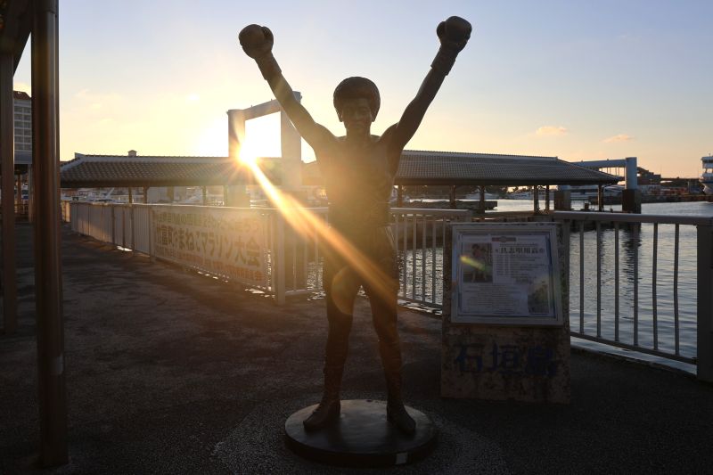 具志堅用高像の向こうに朝陽が