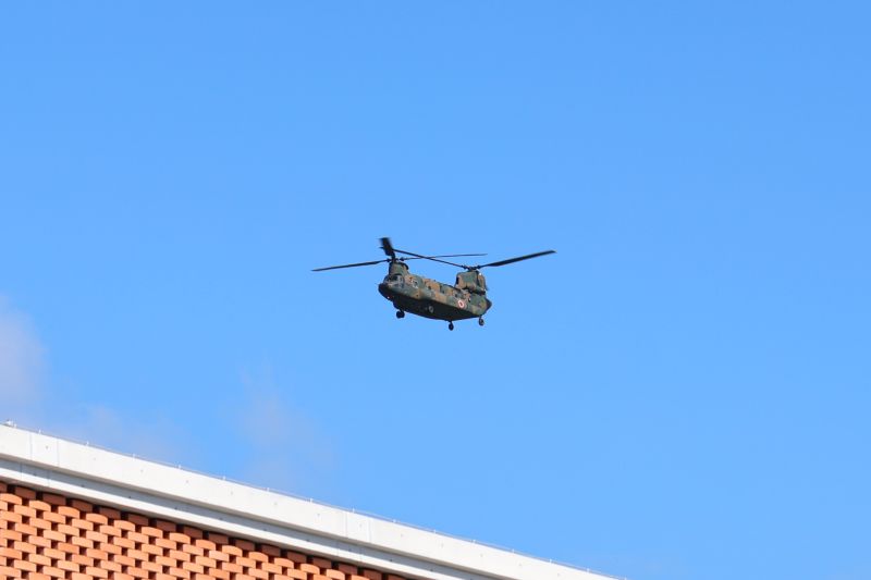 最後の観光を終えて空港へ。大きな音を立てて自衛隊の輸送ヘリが舞い降りてきました