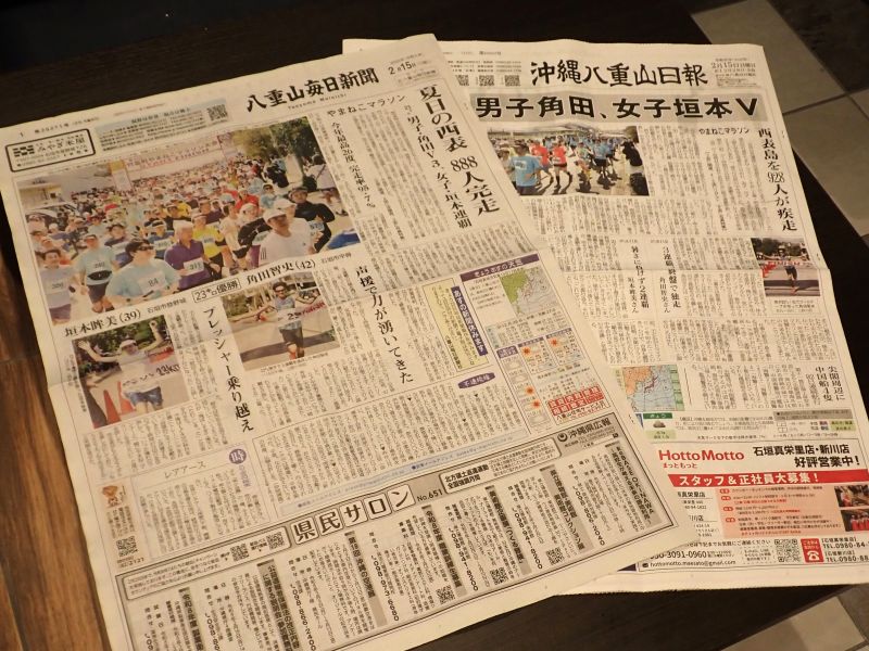 地元新聞の一面は前日西表島で行われたやまねこマラソンの記事でした