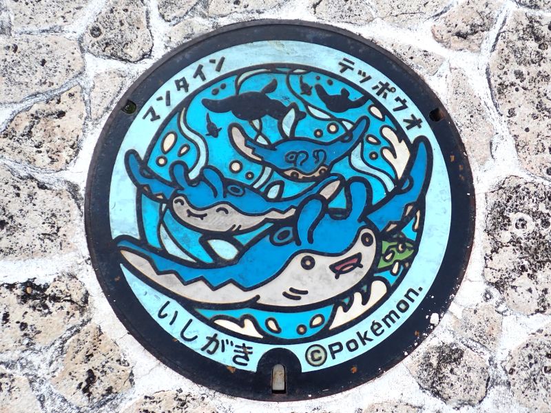 港にポケモンキャラクターのマンホール蓋がありました