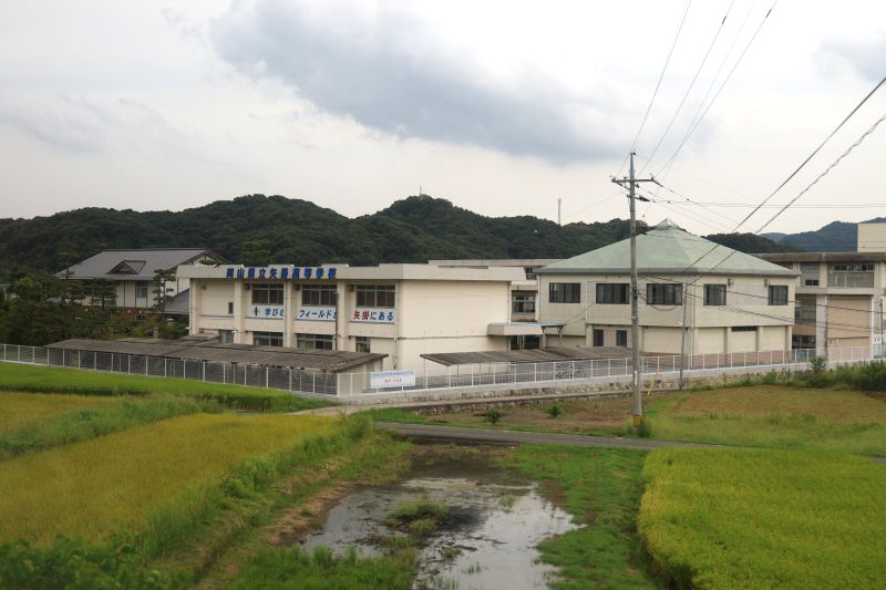 県立矢掛(やかげ)高校。 「学びのフィールドが矢掛(ここ)にある」と横断幕がありました