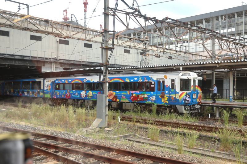 車窓からアンパンマントロッコ列車やレールテックの保線作業車が見えました