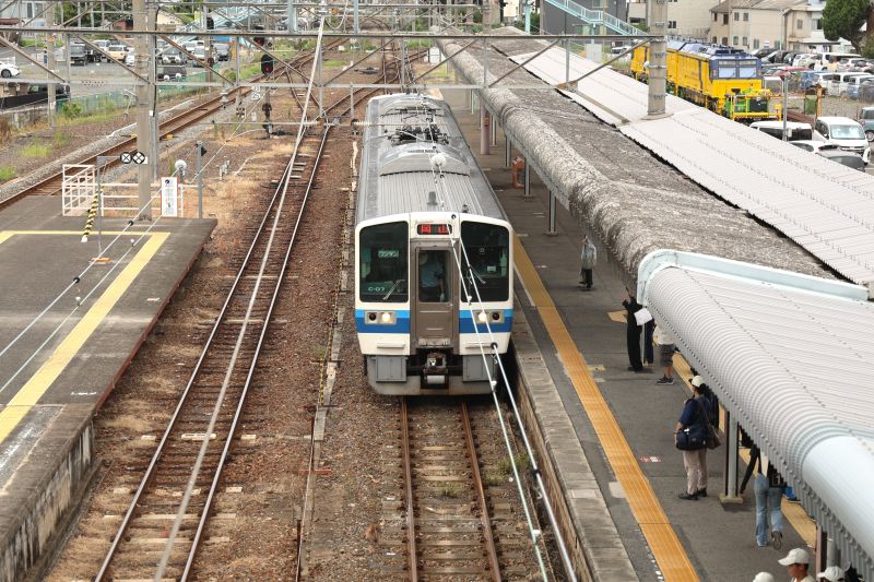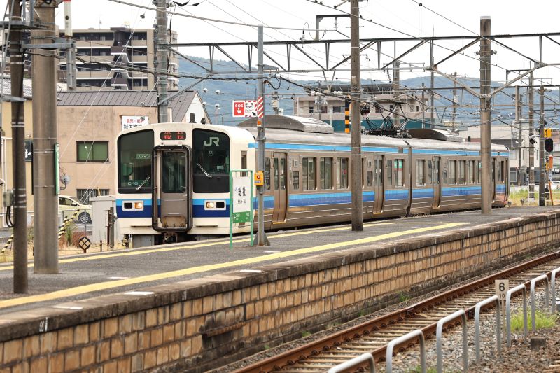 小一時間ホームで過ごしました。電化区間を走るクハ213系。改造によって運転台が取付けられ先頭車両化され前面が白くなっています