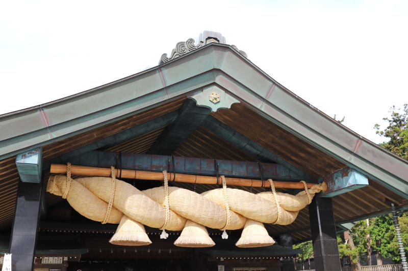 写真は出雲大社神楽殿の大しめ縄。長さ13.6m、重さ5.2㌧(2019年10月撮影)