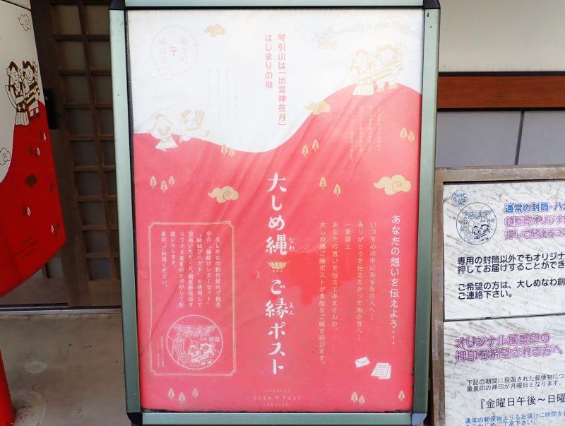 大しめ縄創作館で販売されている「縁結びレターセット」や「縁結びハガキ」を使ってポストに投函すると頓原(とんばら)郵便局オリジナルの消印が押されて届けられるということです。