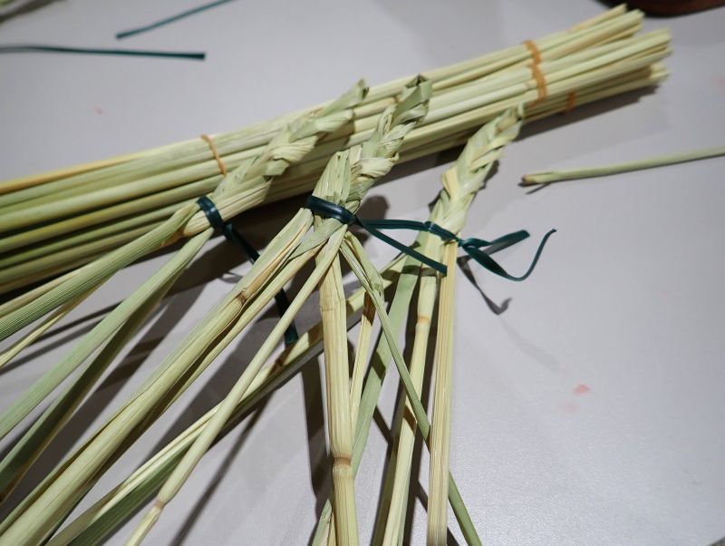 まずは馬の頭部分の製作。ワラを3本束ねて三つ編みにしていきます