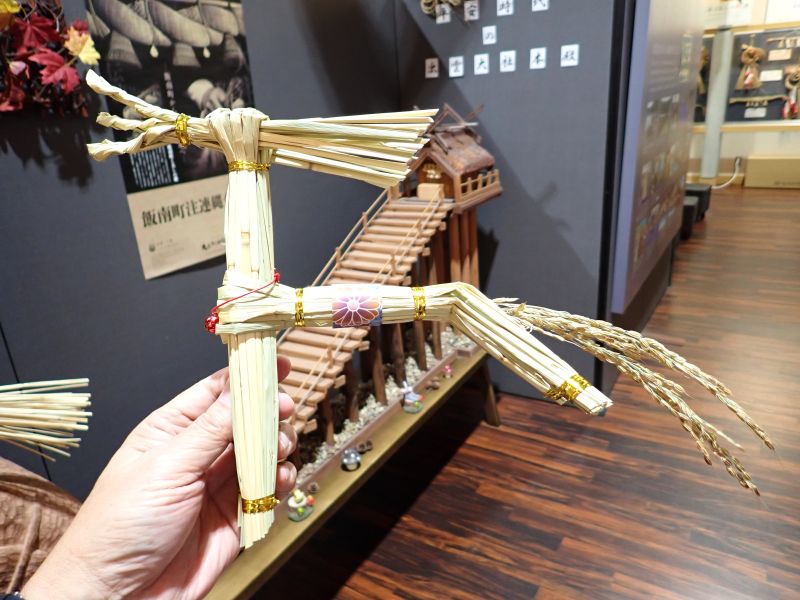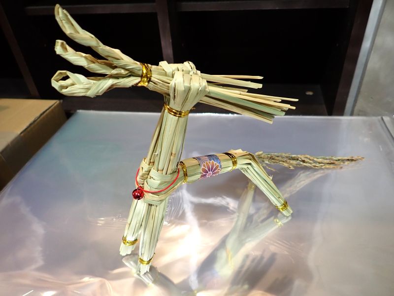 「とろへい」とは正月の伝統行事で、1年の最初の満月の夜に福の神がやってきて人々に福をもたらすという古い民族信仰に基づくものだそう。子どもが福を運ぶ使者となって地域の家を訪ねる際にこのようなわらで出来た馬が届けられるのです。このわら馬は1年の福を運ぶ縁起の良い家の守り神として次の年のとんどまで神棚や床の間などに飾っておくそうです。