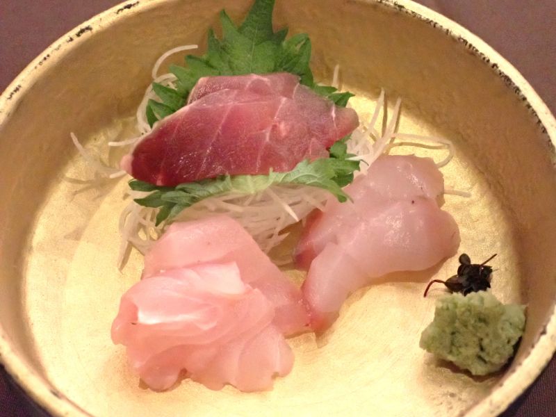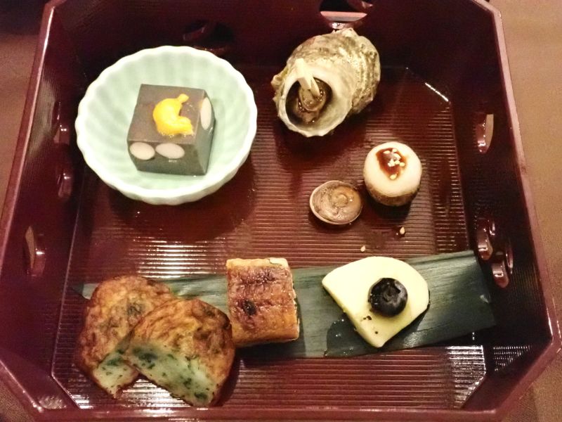 前菜はきぬかつぎ(里芋)、姫栄螺(さざえ)のうま煮、零余子(むかご)石垣寄せ、菜の花さつま揚げ、鰻棒寿司、カプレーゼ