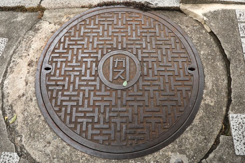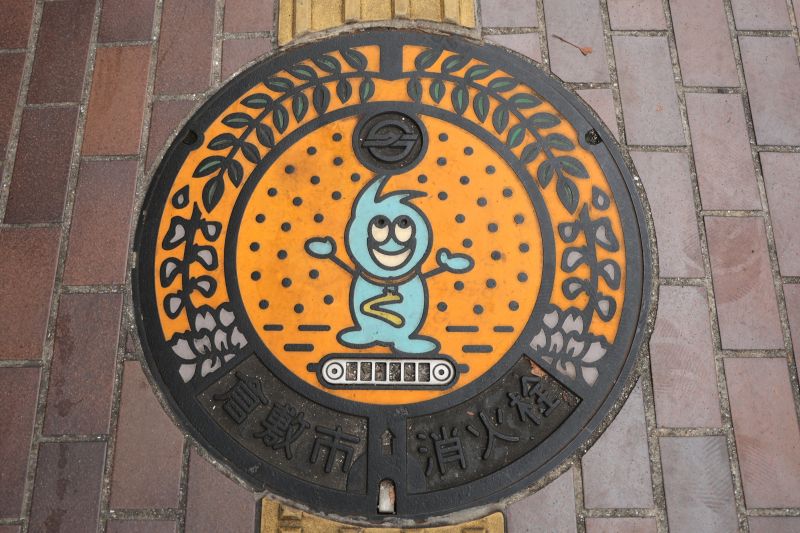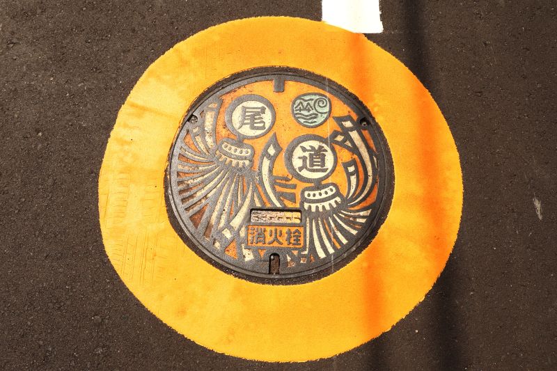 尾道市の消火栓蓋。纏(まとい)がデザインされています