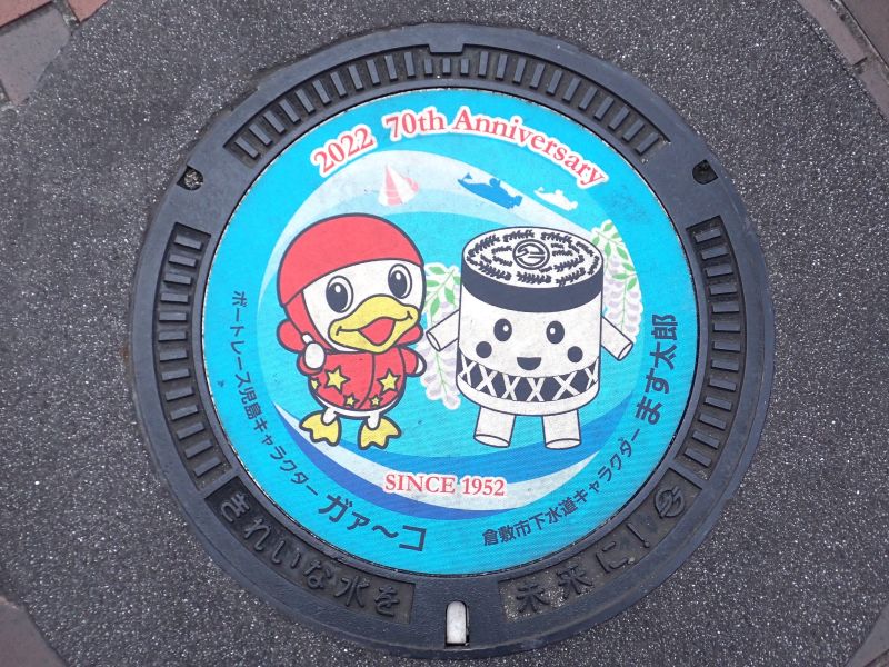 ボートレース児島の開設70周年を記念し、ボートレース児島のキャラクター「ガァ~コ」と倉敷市下水道部のキャラクター「ます太郎」がコラボしたデザイン蓋