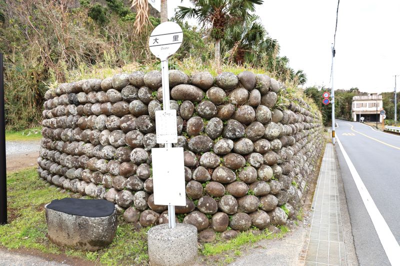 玉石垣とは荒波に削られ角のとれた丸い石だけを使って積み上げられた石垣のことです。島内のあちこちで見られますが、かつて島庁がおかれたここ大里地区の玉石垣が規模・保存状態ともに最良とされています