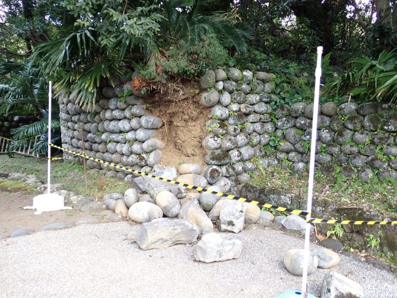 入口の玉石垣は去年10月の台風22号の影響で崩れていました