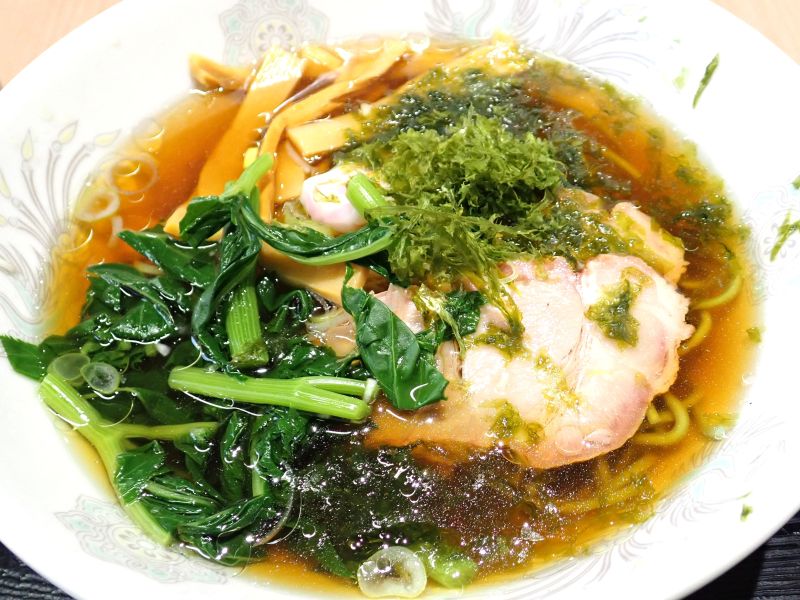 明日葉の葉と茎、厚めのチャーシュー、メンマなどがトッピングされていました。スープはあっさりしょう油