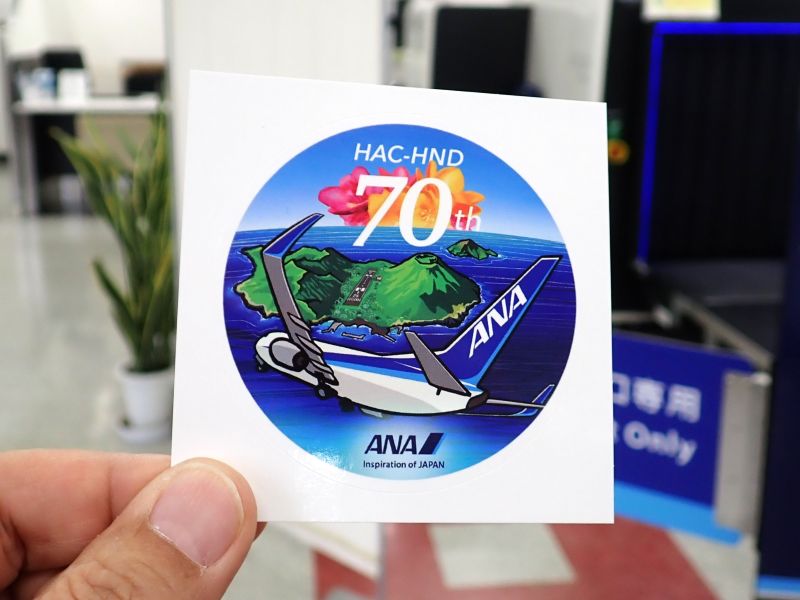 こんなステッカーをもらいました。八丈島と羽田を結ぶANA路線は70周年なのですね
