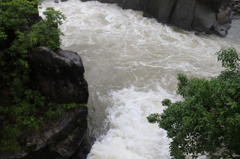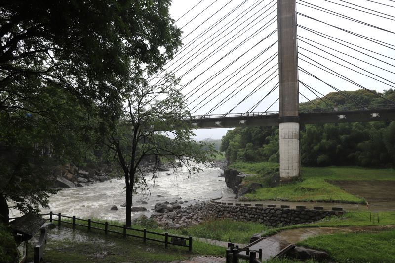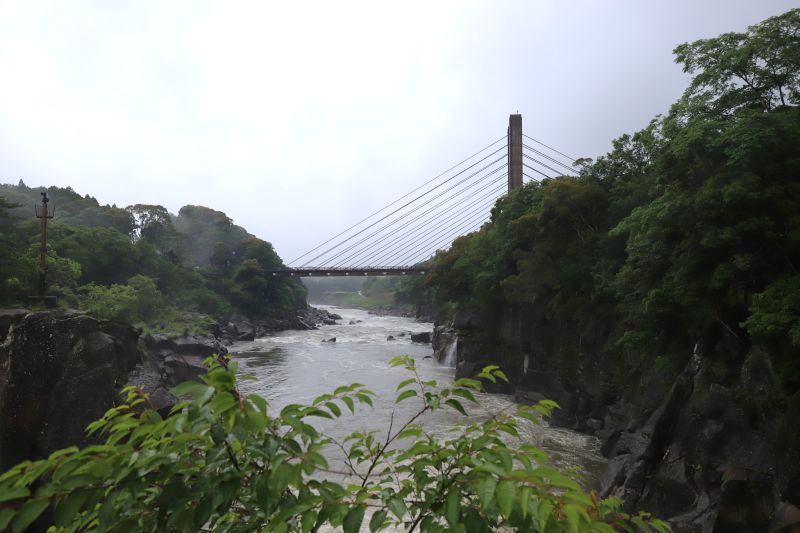 最も高い場所の谷間にかかる赤い三井野大橋を渡ります
