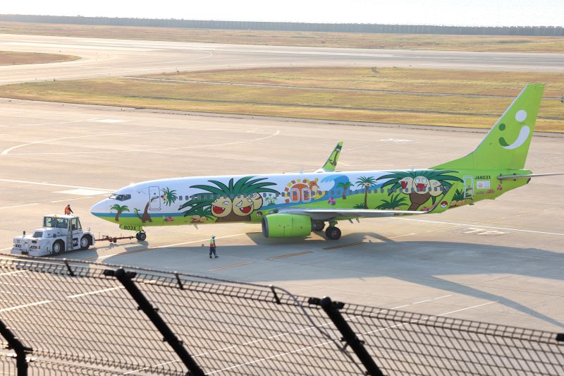 特別塗装機「ナッシージェット宮崎」にはナッシーとアローラナッシーが大きく描かれ南国の雰囲気たっぷり。ナッシーは南国宮崎の県木であるヤシ科のフェニックスをモチーフにした「歩く熱帯雨林」と呼ばれるキャラクター。アローラナッシーとともに「宮崎だいすきポケモン」任命されているそうです