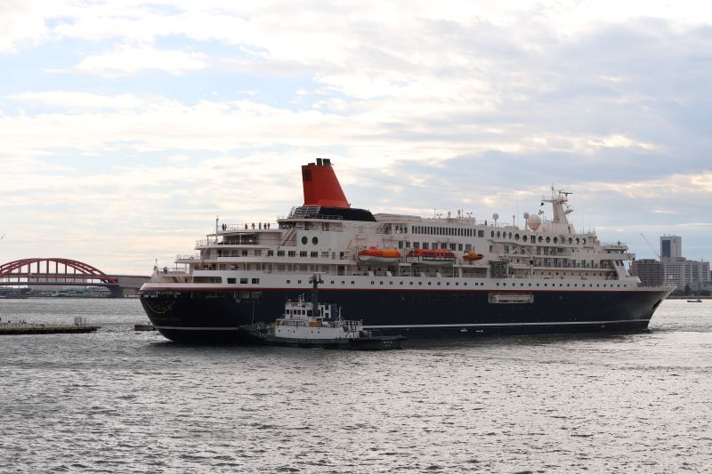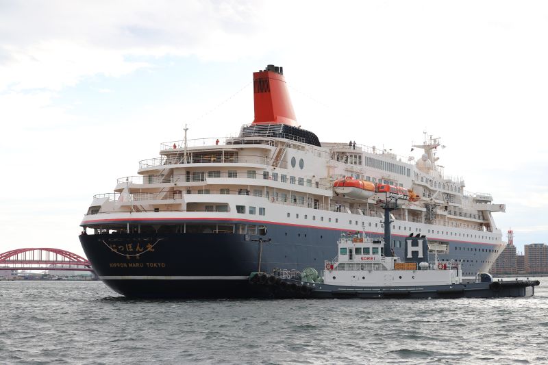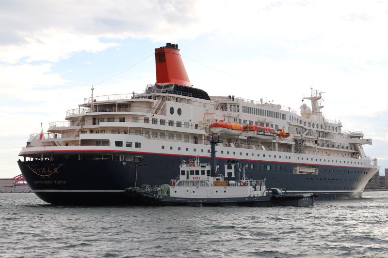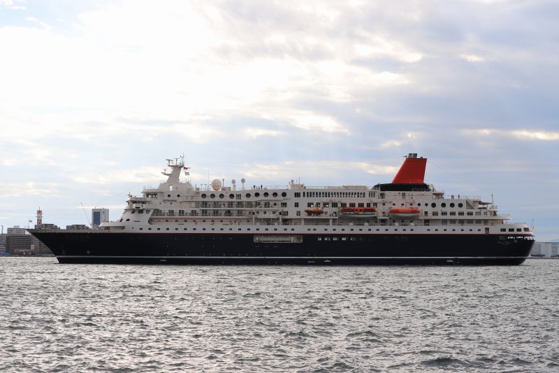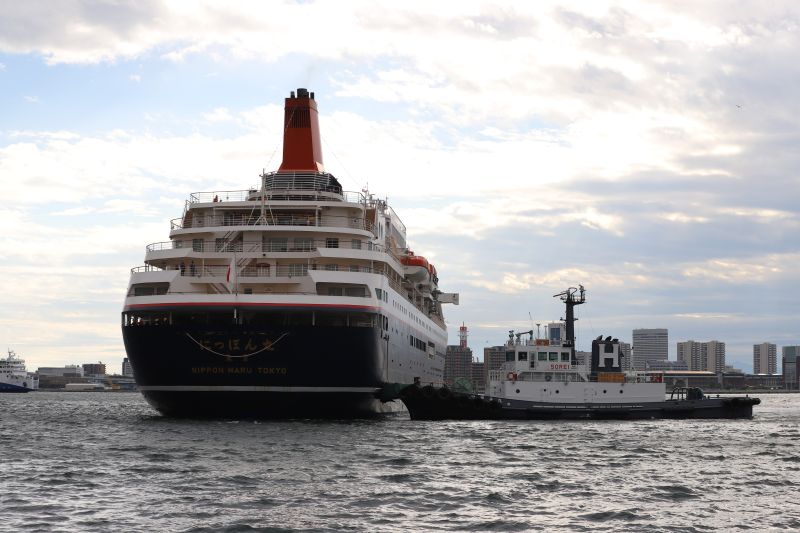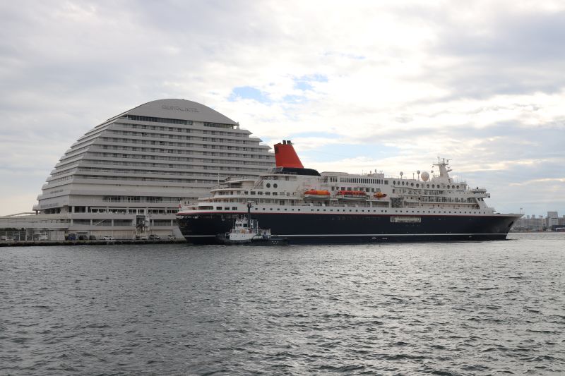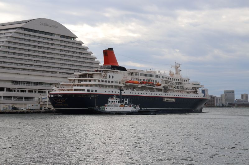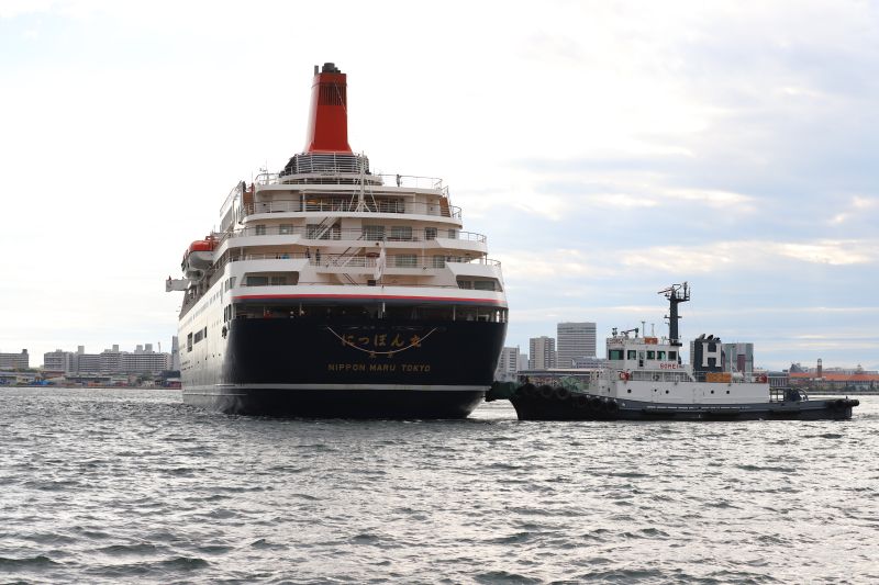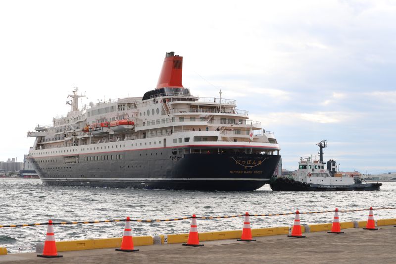 客船「にっぽん丸」神戸入港~船首を浜側に向けて着岸