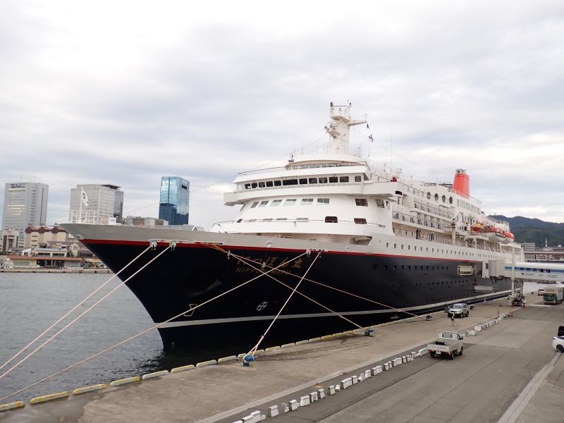 先週土曜日の朝、やや強い風が吹き時折小雨の混じる空模様の中、商船三井クルーズが運航する客船「にっぽん丸(22,472㌧)」が神戸港中突堤に入ってきました