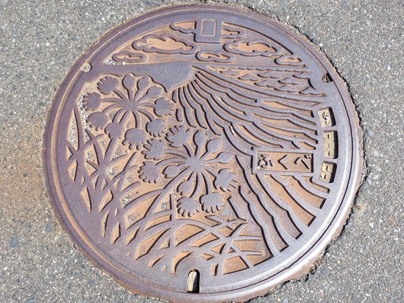 梨狩り園近くで見かけたマンホール蓋。「ふくべ」とは鳥取市福部町のことで、鳥取市に編入される前の岩美郡旧福部村(ふくべそん)のもの。図柄はらっきょうの花と鳥取砂丘の風紋が描かれています
