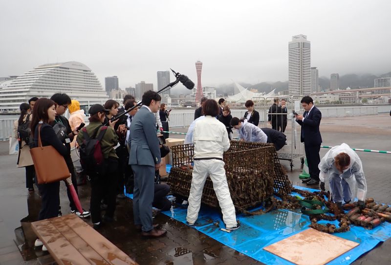 この日は時折雨の降る日でしたが報道陣も駆けつけ引き上げを見守りました