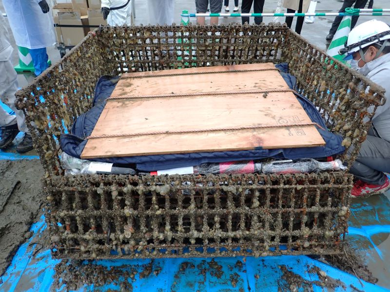 今回引き上げられたワインの数々。引き上げられた籠には海藻類が付着!