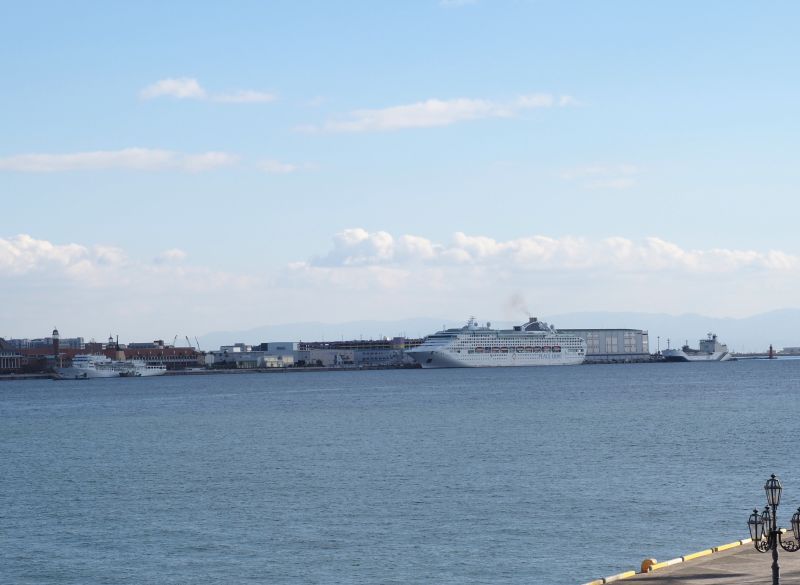 まん中の大きな船は7日から停泊している客船「パシフィック ワールド」