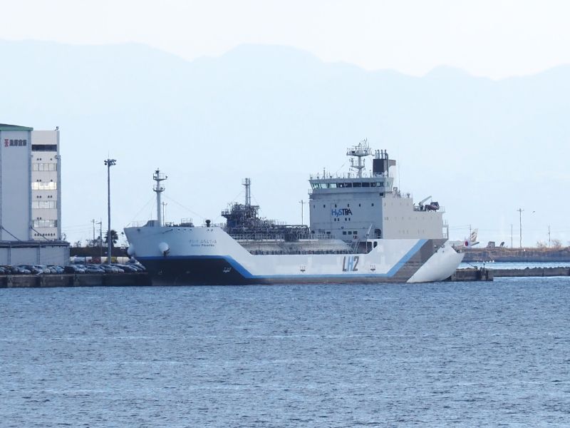 そして後方には世界初の液体水素運搬船「すいそふろんてぃあ(7,849㌧)」が停泊していました。オーストラリアとの往来の中で、帰国時は神戸空港島東の液化水素受入基地に停泊していることが多いのですが・・・