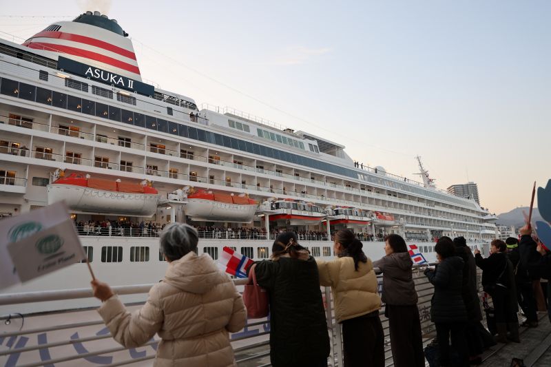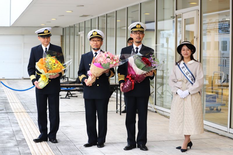 出港前には中突堤旅客ターミナル2階送迎デッキで出港セレモニーが行われ、渡辺船長らに神戸観光親善大使から花束の贈呈などが行われました